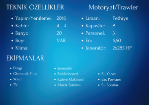 Deniz tutkunları için mavi yolculuk, huzur, lüks ve unutulmaz anılarla dolu bir tatil deneyimi sunar. Fethiye ve Göcek bölgelerinin benzersiz koylarında, 2016 model özel yapım Ruzanna motoryat / trawler ile mavi yolculuğun tüm keyfini çıkarabilirsiniz.